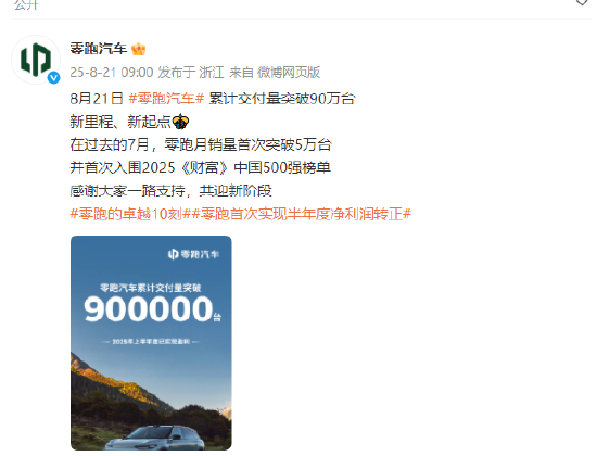 零跑汽车通过官方微博秘书,8 月 21日开yun体育网,零跑汽车累计委用量梗阻 90 万台。